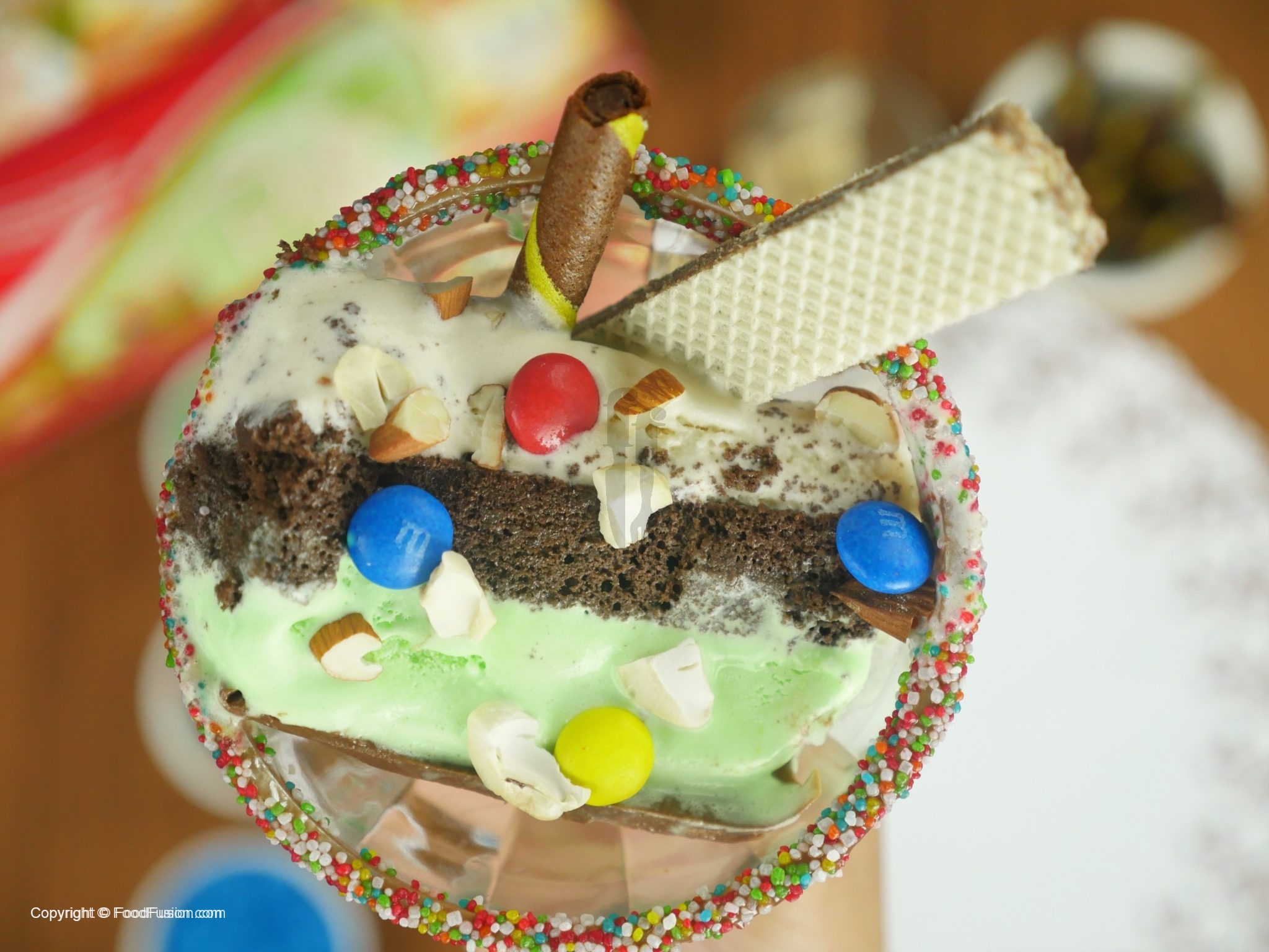 For glass decoration,take ice cream bowl, dip into melted chocolate and coat with rainbow sprinkles.