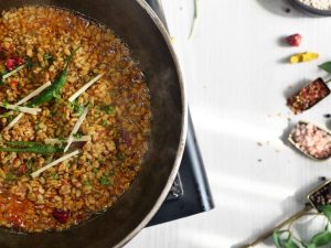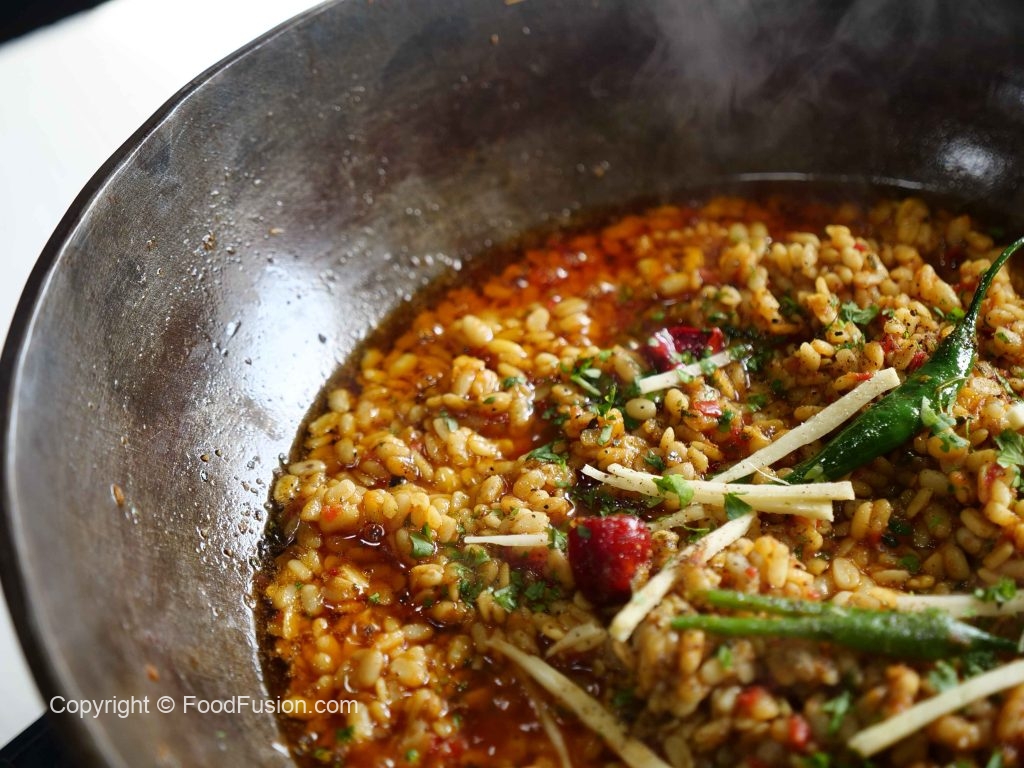 -Add ginger garlic paste,pink salt & mix well,cover & cook on low flame until 90% done (9-10 minutes),strain & set aside.