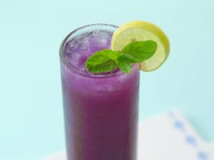 -Glass mein crushed ice,tayyar butterfly pea syrup (3/4 cup) aur edible silver glitter dal ker ache tarhan mix ker lein.