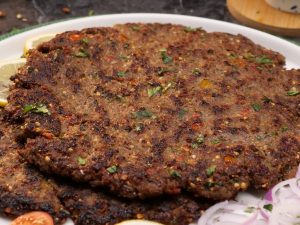 -In a bowl,add grated & squeeze onion,beef mince,ginger garlic paste,green chilli,tomatoes,carom seeds,red chilli crushed,salt,coriander seeds,cumin seeds,dried pomegranate,garam masala powder, wheat flour,fresh coriander,mix well & knead for 10-12 minutes.