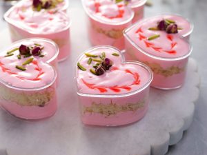 -In a serving cup,add prepared rose cream,pistachios,almonds,syrup coated pheni & spread evenly then add prepared rose cream & garnish with rose syrup,pistachios & dried rose buds (makes 8-9).