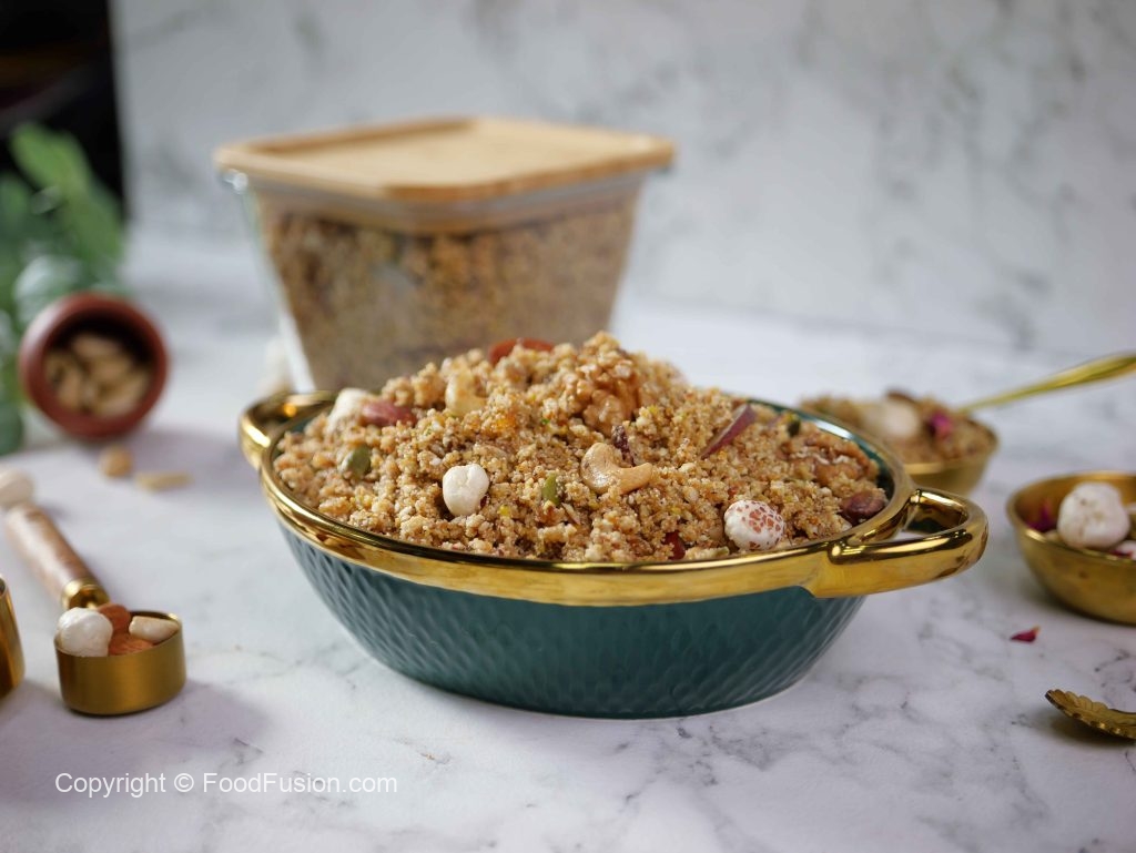 -Chopper mein roasted lotus seeds aur fried edible gum add karein, coarsely chop kar ke bowl me transfer karein.