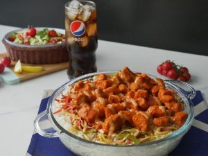 Fried chicken boneless cubes shamil karein aur mix ker lein.