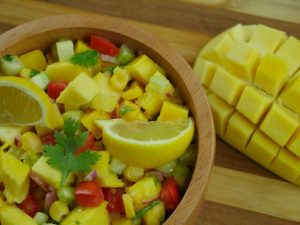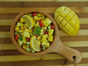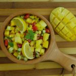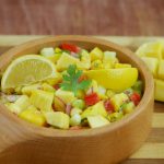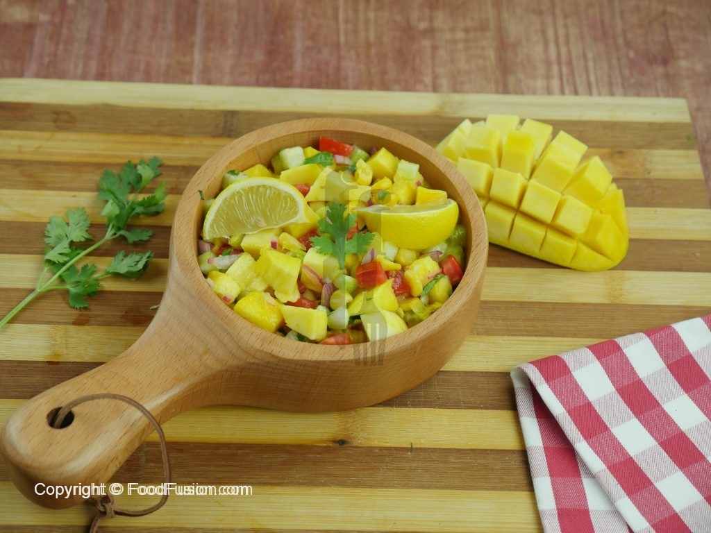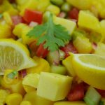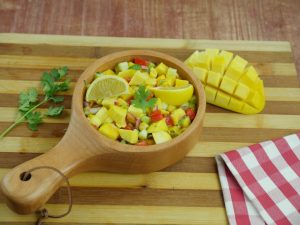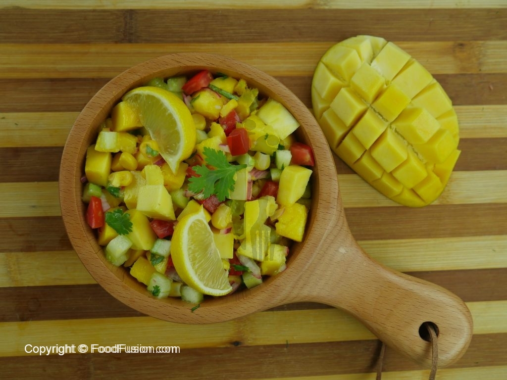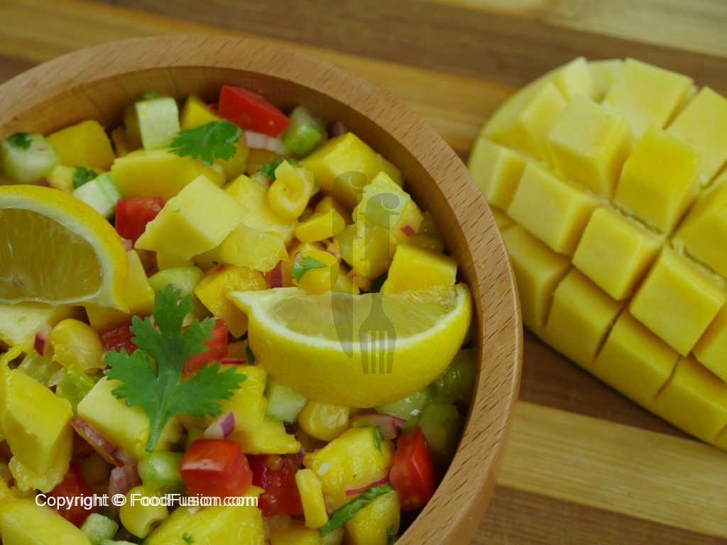 In bowl add mango cubes, cucumber cubes and tomato cubes, corn boiled and coriander leaves.