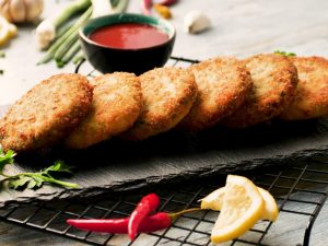 -Ab chicken ko all-purpose flour se coat karein, phir whisked eggs mein dip karein aur breadcrumbs se achi tarah coat karein.