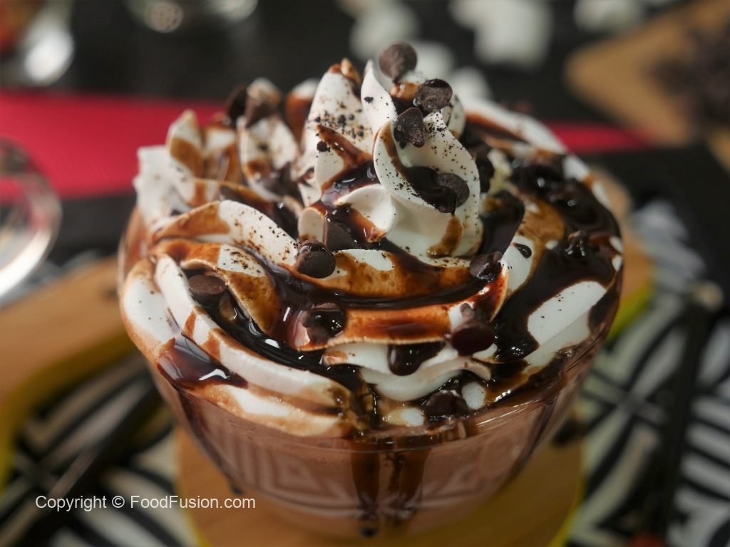 Serving cup mein nutella hot chocolate,whipped cream,chocolate chips,chocolate syrup aur cocoa powder dal ker serve karein.