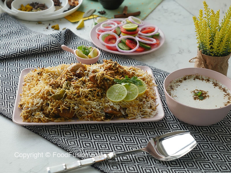 Add mint leaves,boiled rice,remaining prepared spice mix,fried onion,remaining boiled rice and ghee,cover & cook on high flame to build up the steam (4-5 minutes) then turn flame to low and steam cook for 25-30 minutes.