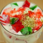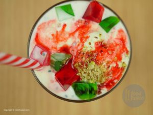 Glass mein lal sharbat,corn flour ki seviyan,tukh malanga,green jelley,red jelly,mix dry fruits,rabri (thickened milk),vanilla ice cream,red jelly,green jelly,mix dry fruits aur lal sharbat dal dein.