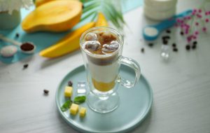 -Glass mein mango puree (2-3 tbs),ice cubes,tayyar milk mixture (1/2 Cup) aur dissolved coffee (2 tbs) dal ker ache tarhan mix ker lein & serve karein!