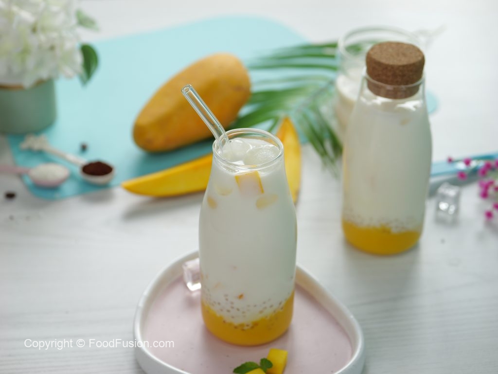-Glass bottle mein tayyar mango puree (2-3 tbs),boiled sagudana (2 tbs),condensed milk mango chunks,ice cubes aur doodh dal ker stir ker lein & serve karein!