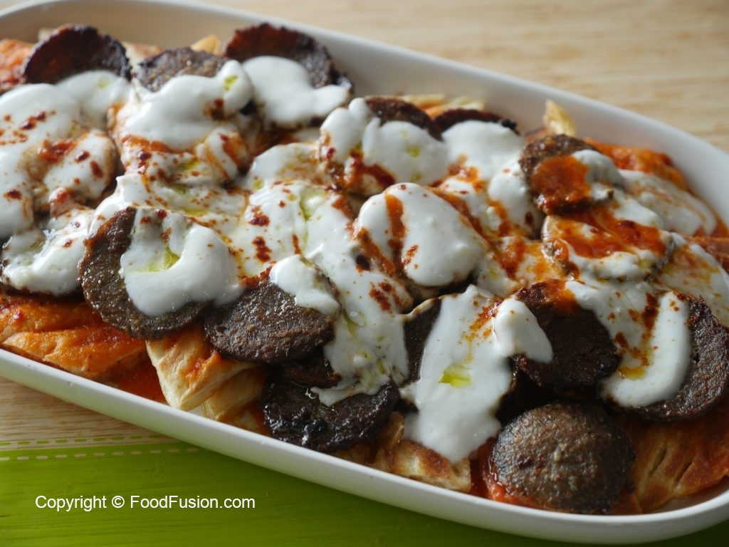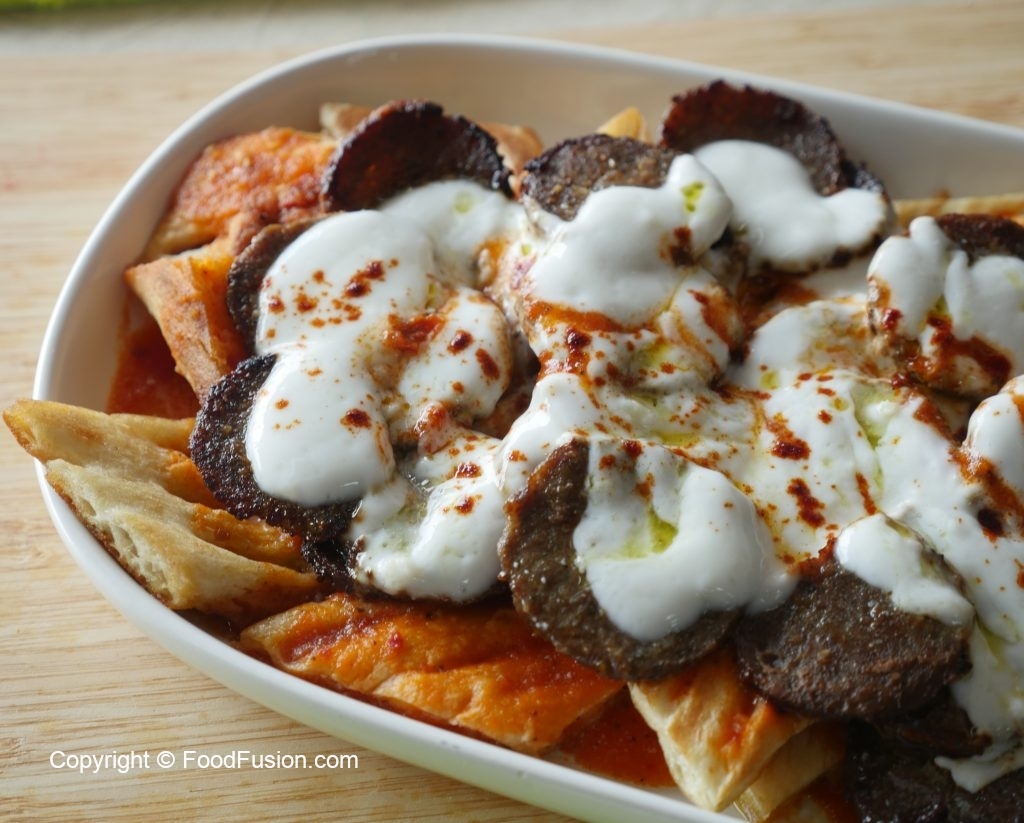 On a serving plate,add naan pieces,prepared tomato sauce,iskandar kabab slices,garlic yogurt sauce