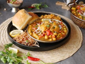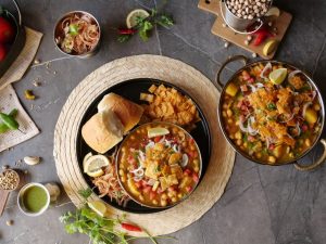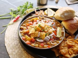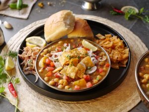 -On a serving plate,add khathiawari cholay,prepared hari chutney,tomato,chaat masala,red chilli crushed,onion,papri,fresh coriander & serve with pav buns!