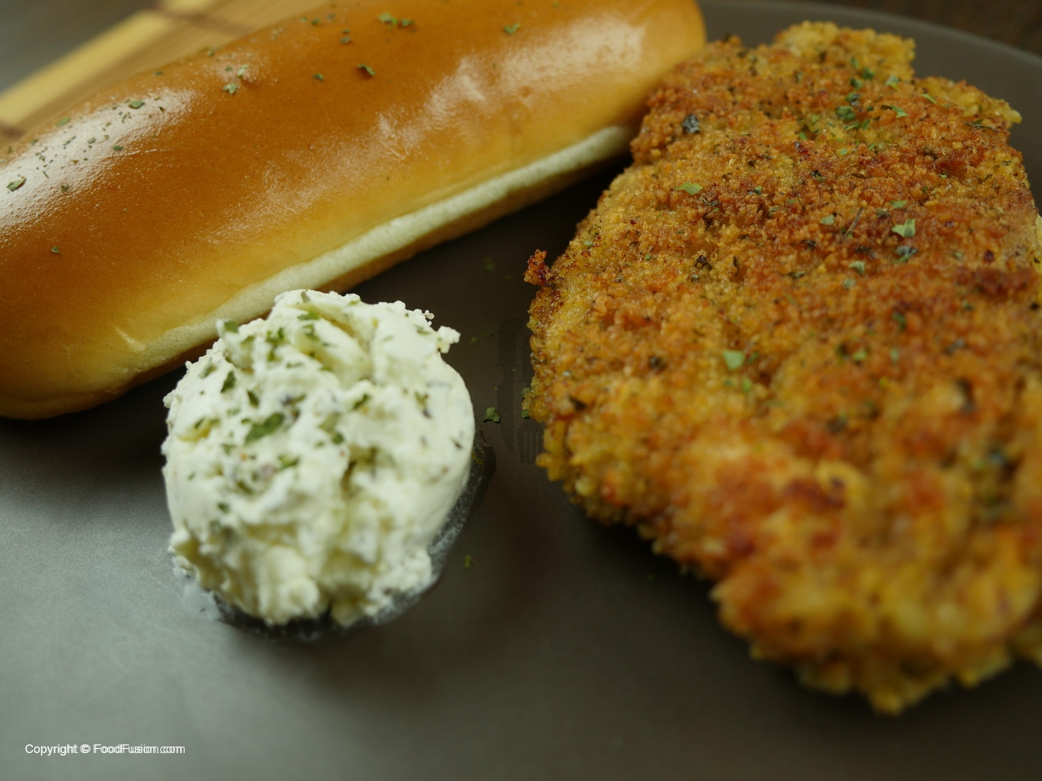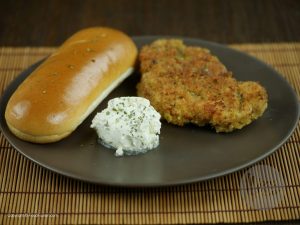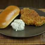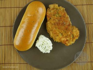 Finally coat the chicken fillet in breadcrumbs that consists of dried parsley and garlic powder.