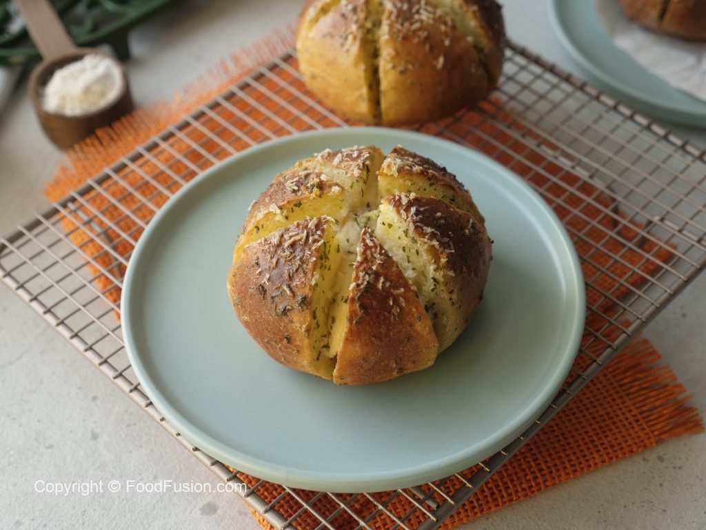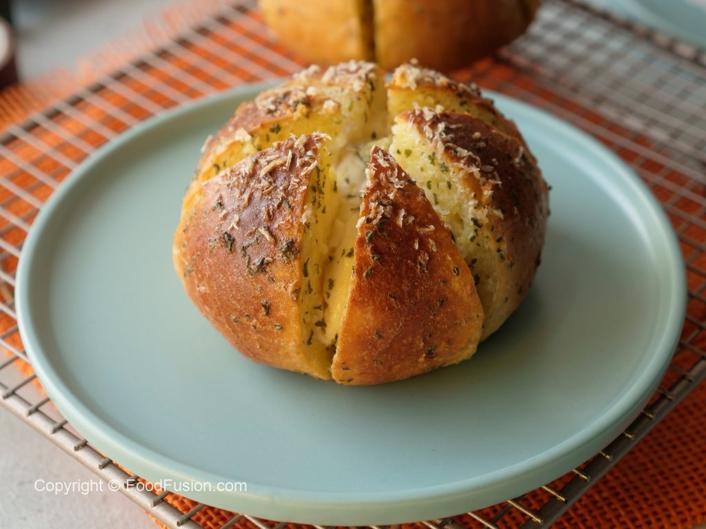 After the bread has been cut,pipe a rope of cream cheese filling in between each wedge and dip the entire bread into prepared garlic butter mixture.