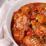 In a bowl,add gochujang paste,soy sauce,hot sauce,oyster sauce,garlic,sugar,red chilli crushed, chicken powder,water,whisk well & set aside.