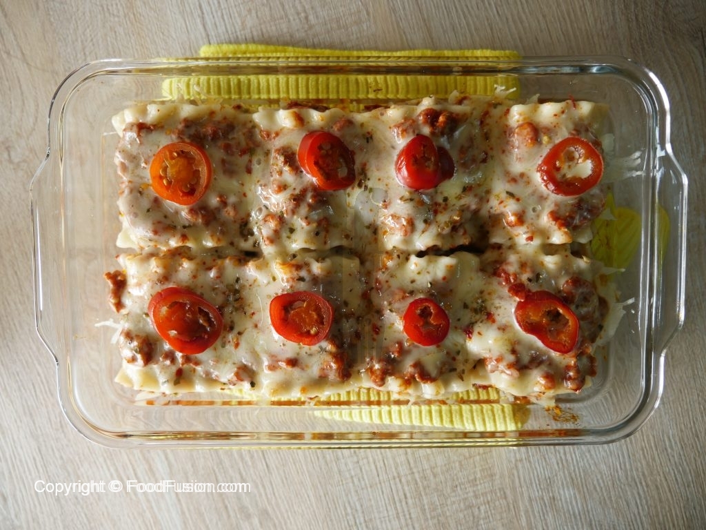 Lasagna sheets per white sauce aur red sauce with mince dal ker pheela lein aur roll ker lein.