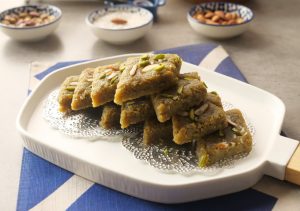 Cut in pieces, garnish with pistachios & almonds.