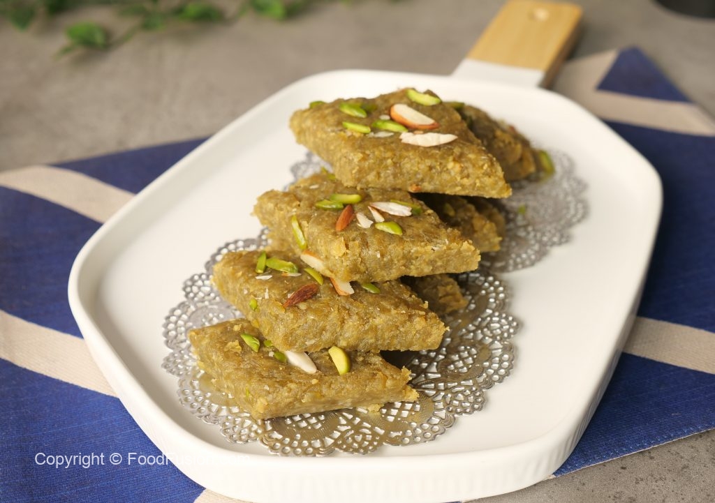 Mithai ki consistency check karne k liye aik chota si quantity len or ball banayen. Agar ball smooth banay to mithai ready hai.