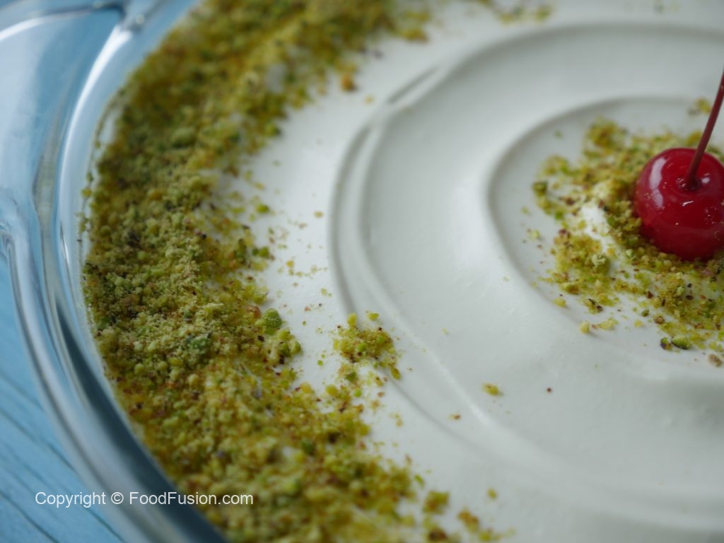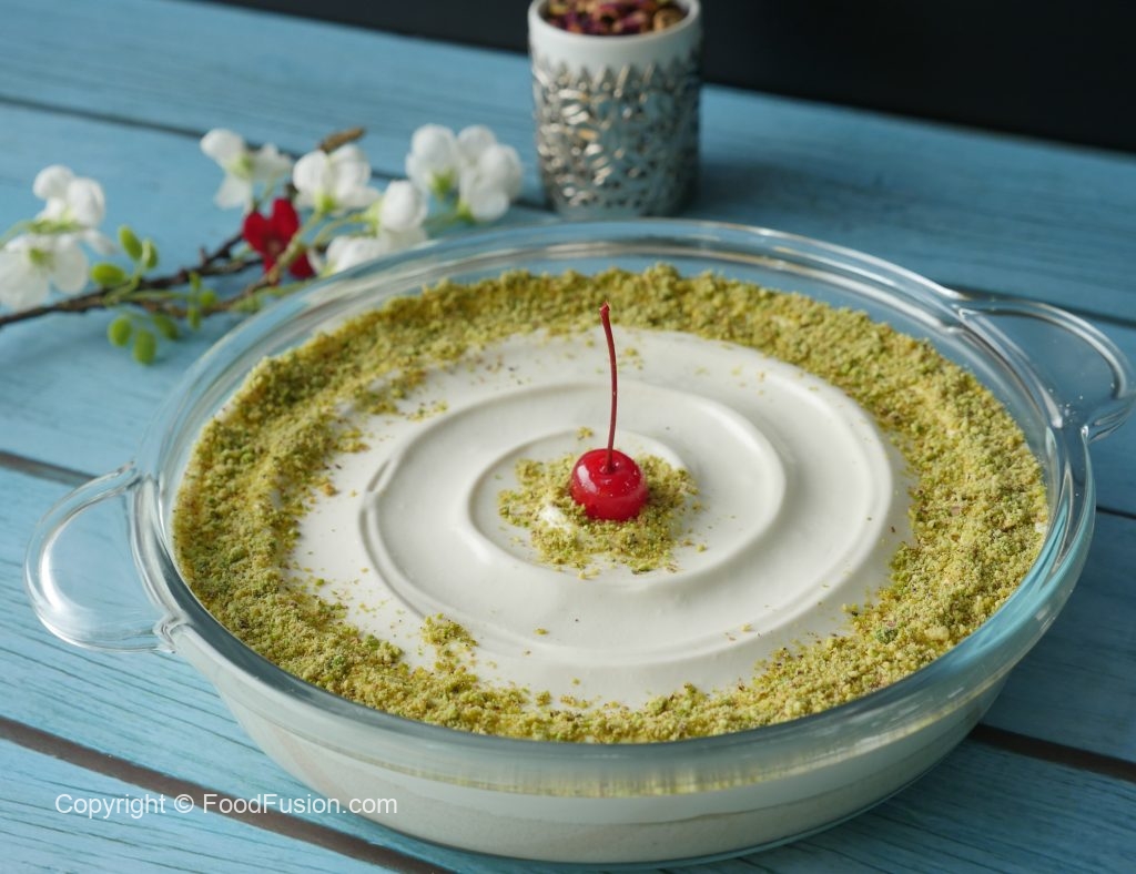 Serving dish mein tayyar cream ki layer dal ker evenly pheela lein.