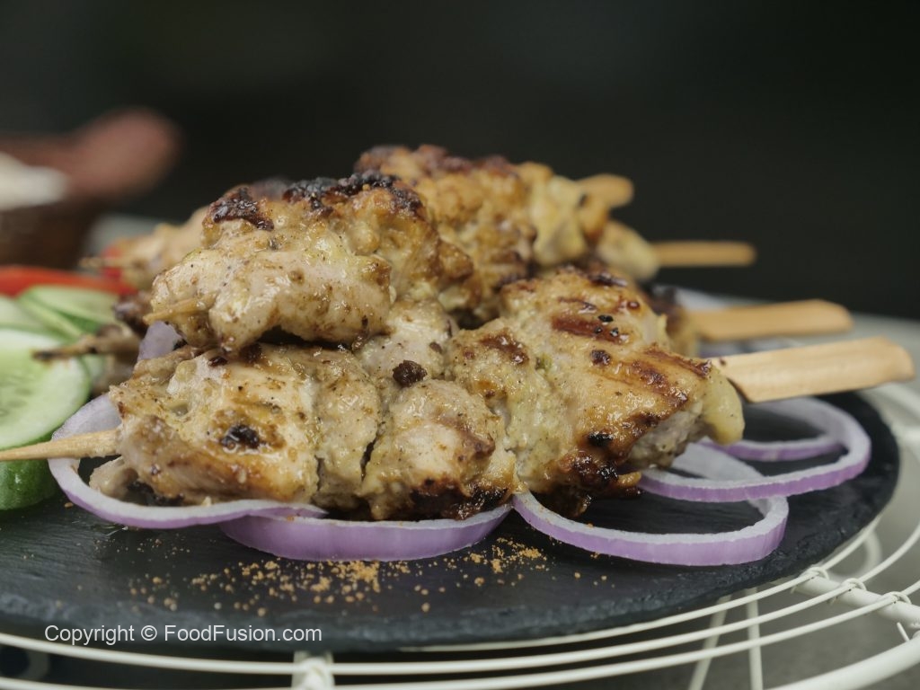 Marinated chicken ko wooden skewers per laga lein (makes 9-10).