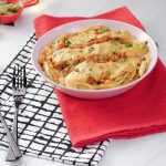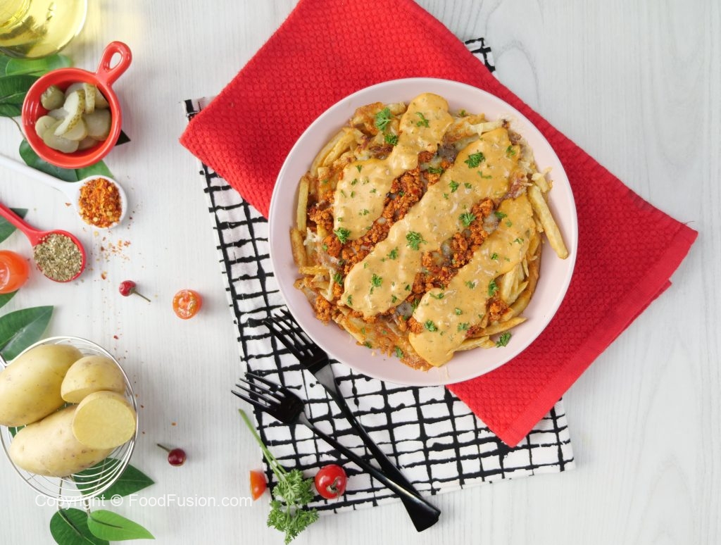 -On a serving dish,add potato fries,prepared hot chicken filling,caramelized onion,cheddar cheese, mozzarella cheese & air fry at 180°C until cheese melts (3-4 minutes).