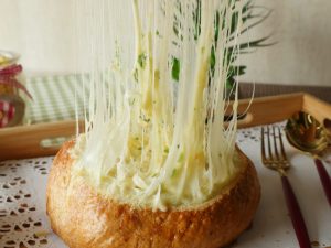 Bread bowl mein mac n cheese pasta,mozzarella cheese,parmesan cheese powder aur fresh parsley dal ker top sa cover ker dein.