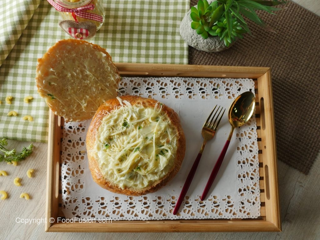 In bread bowl,add mac n cheese pasta,mozzarella cheese,parmesan cheese powder,fresh parsley and cover with top.