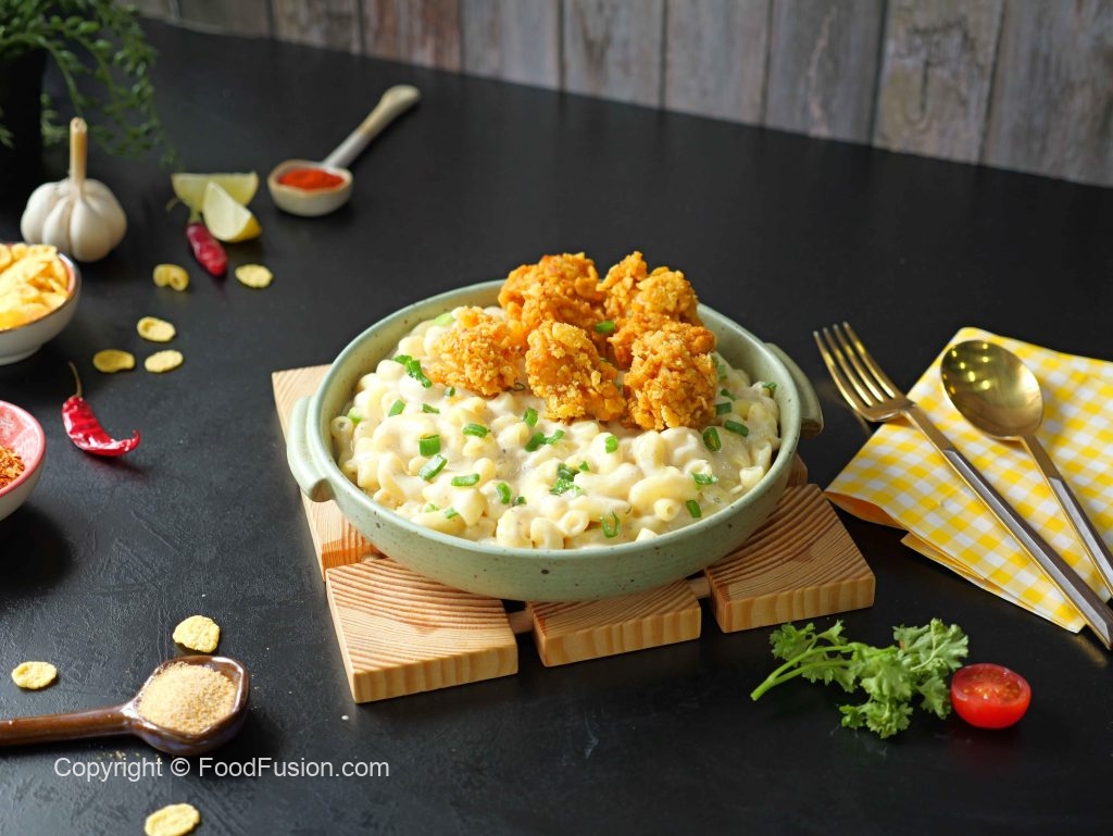 Mac & Cheese with Popcorn Chicken — a lunchbox favorite and comfort food classic! Creamy, cheesy pasta paired with crispy chicken bites makes every bite a treat. Perfect for school, work, or a cozy meal at home! #happycookingtoyou #foodfusion #araywahh #lunchboxideas