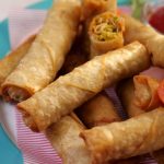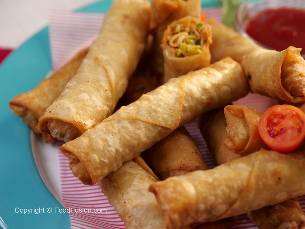 -Cut roll sheets diagonally,making a triangular shape,take one triangle sheet,add prepared filling,apply flour slurry,fold & roll up (makes 18-20).