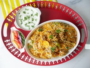 Add dissolve food color,fried onion,cover & steam cook on low flame for 10-12 minutes & serve!