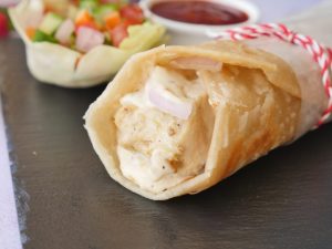 Paratha per tayyar creamy white sauce,chicken malai boti,pyaz aur creamy white sauce dal dein aur roll ki tarhan fold karein aur butter paper mein wrap ker ka serve karein! (Makes 4).