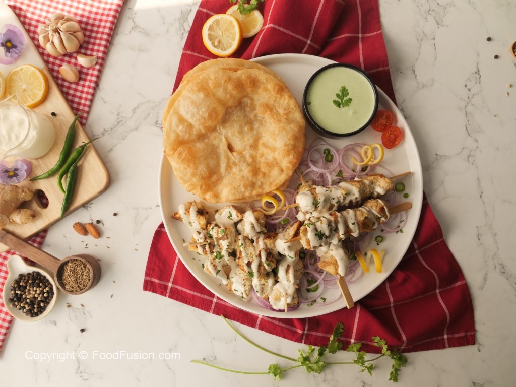 -Drizzle creamy garlic sauce over malai tikka bites,sprinkle fresh coriander & serve with puri paratha, green chutney & onion rings.