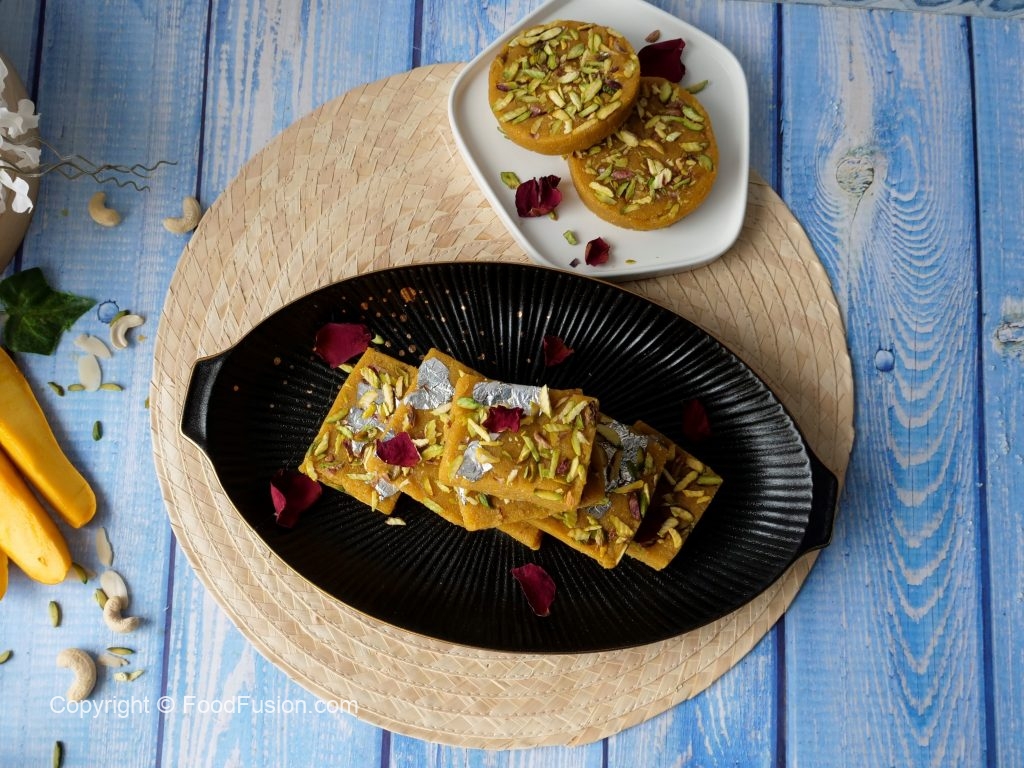 Add mango puree (approx. 1 & ½ Cup),mix well & cook on medium flame for 2-3 minutes.