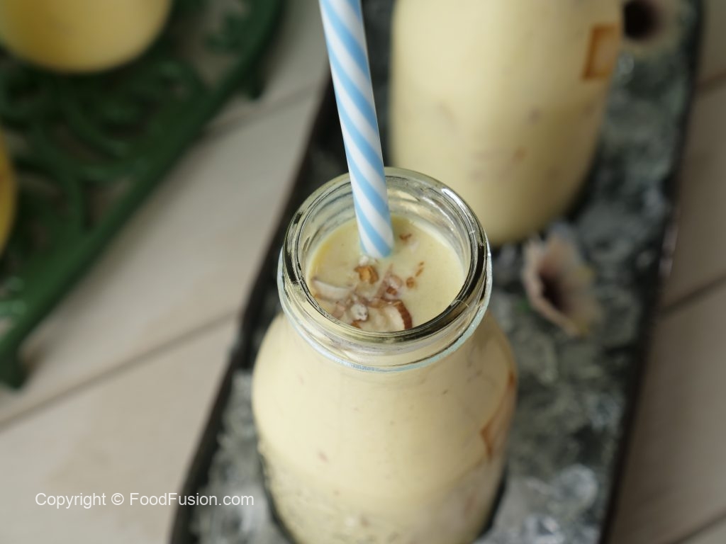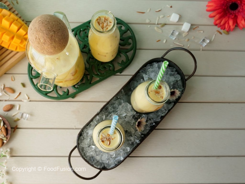 Serving bottle mein mango jelly cubes,tayyar doodh aur badam dal dein.