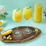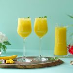 -Blending jug mein mango mixture,cheeni,lemon juice aur yellow food color dal ker ache tarhan blend ker lein phir stainer ki madad sa strain ker lein.