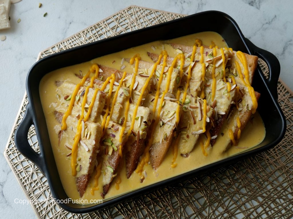 In a serving dish,place bread slices,sprinkle desiccated coconut,pour prepared mango milk syrup,add pistachios,almonds,drizzle prepared mango & cream sauce and serve chilled!