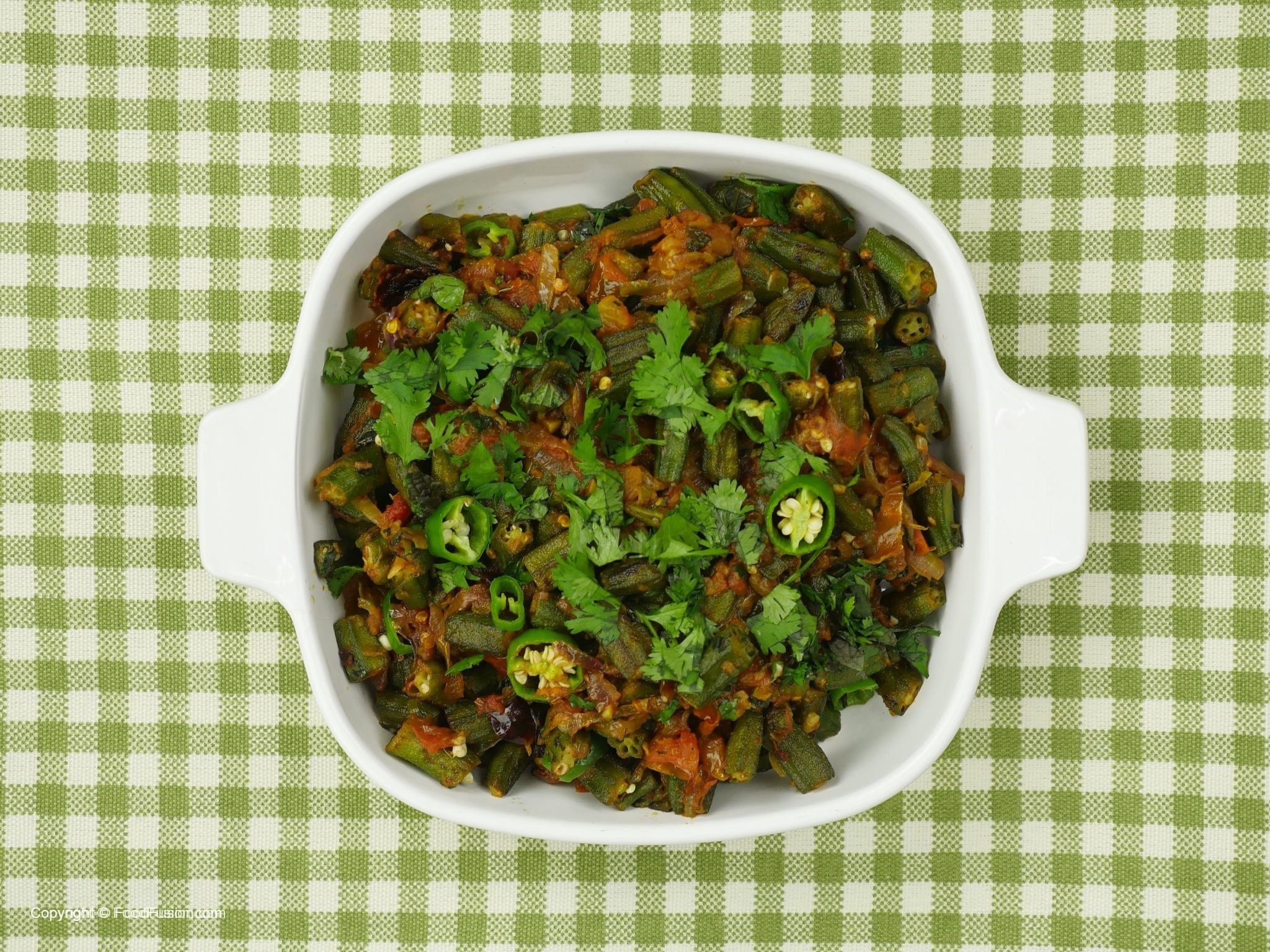 In pot,add oil,okra and fry for 4-5 minutes and set aside.