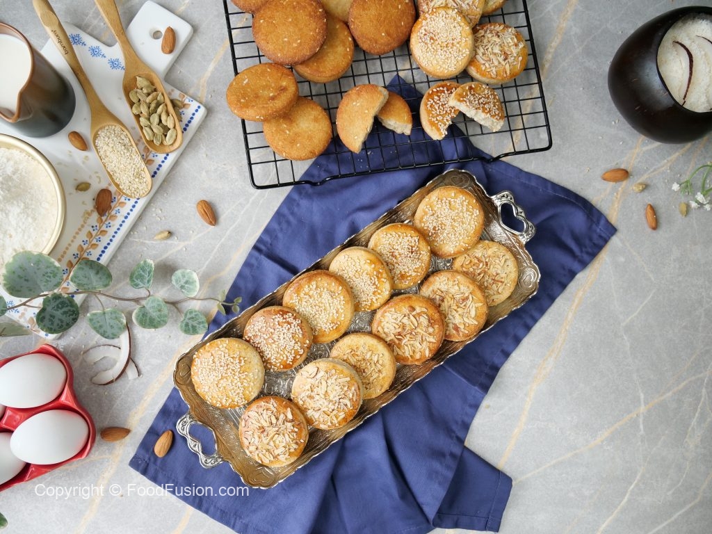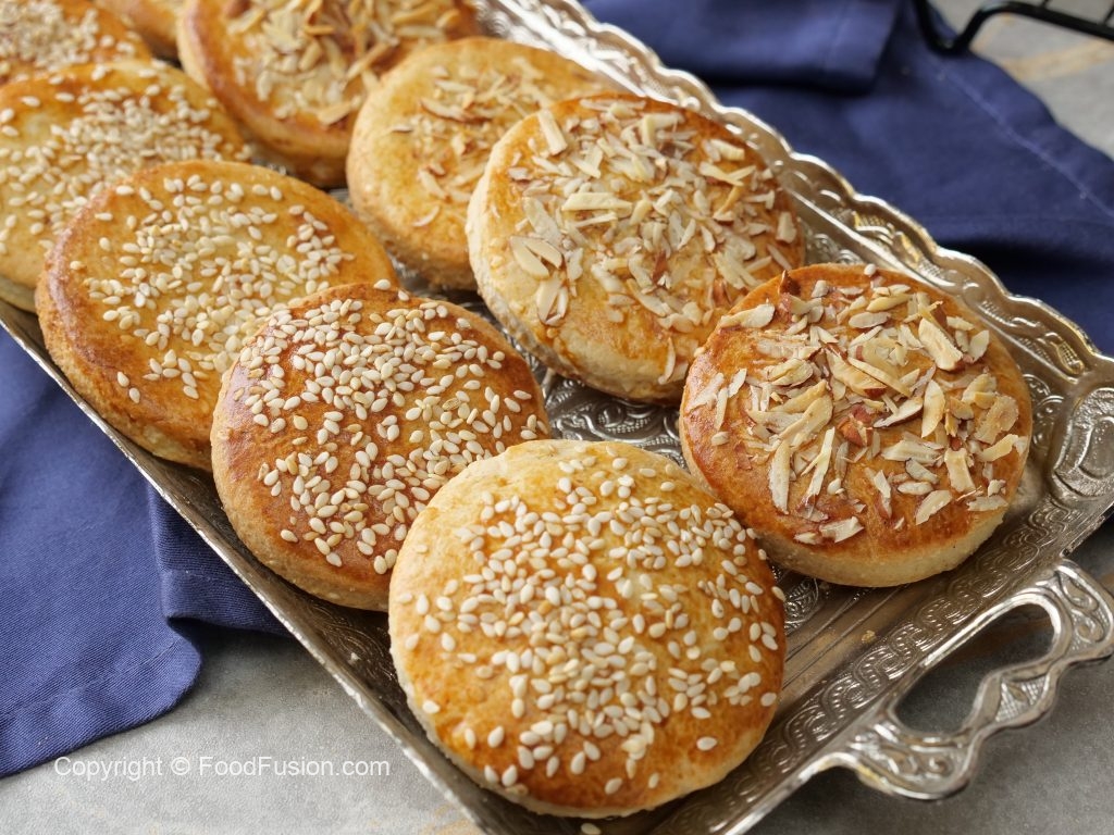 -Place tikiyan on greased baking tray,apply egg with the help of brush,sprinkle almonds & sesame seeds.
