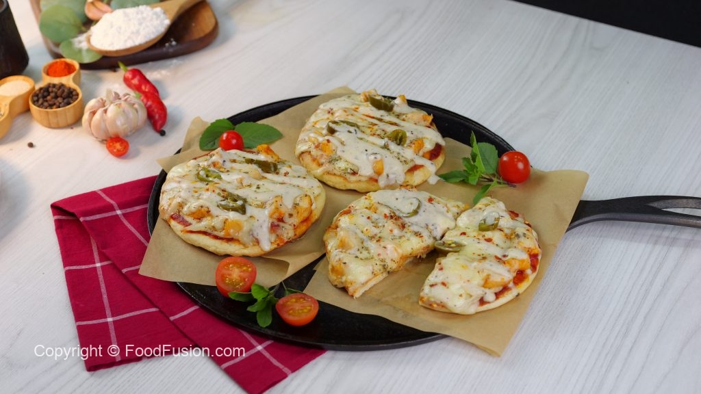 -Turn off the flame,on cooked naan,add & spread pizza sauce,add cooked chicken,prepared alfredo sauce,cheddar cheese,mozzarella cheese,pickled jalapenos,sprinkle red chilli crushed & dried oregano,cover,turn on the flame & cook on low flame until cheese melts (3-4 minutes).