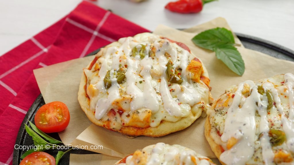 -Chulha bund ker dein,cooked naan per pizza sauce dal ker pheela lein,cooked chicken,tayyar alfredo sauce,cheddar cheese,mozzarella cheese,pickled jalapenos,lal mirch crushed & dried oregano dal ker dhak dein,chulha on karein aur halki ancch per cheese melt ho janay tak paka lein (3-4 minutes).