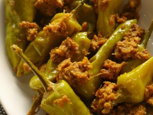 Slit green chilies with the help of the knife and stuffed with prepared spice mix.