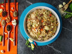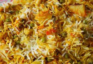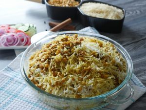 Add boiled rice,fried onion,cover and steam cook on low flame for 8-10 minutes & serve!