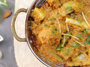 -Scum ko remove ker lein,pink salt,adrak lehsan paste, aur hari mirchein dal ker ache tarhan mix karein aur dhak ker halki ancch per 90% done ho janay tak paka lein (30-35 minutes) (1 & ½ Cup water should remain).