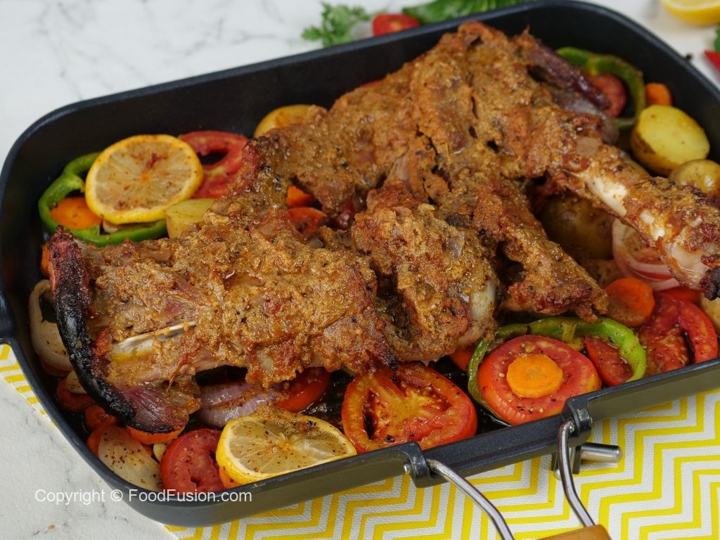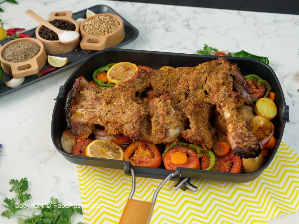 Extra thick parchment paper rakh ker marinated leg rakh dein aur dhak ker halki ancch per gul janay tak paka lein (1 hour).