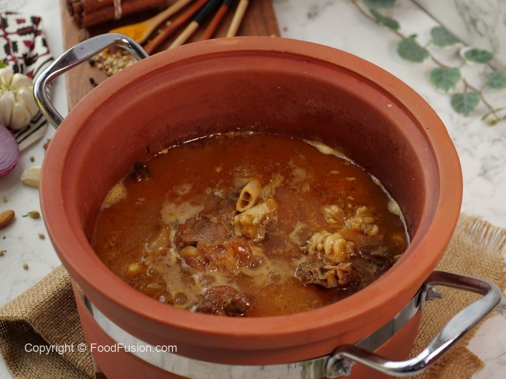 In mutton trotters,add salt,black cardamom,cloves,black peppercorns,cinnamon sticks,bay leaf,ginger garlic paste,hot water and mix well,bring it to boil,cover and cook on low flame until tender (2-3 hours) 3 cups of water should be left.