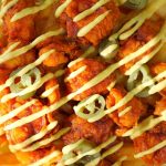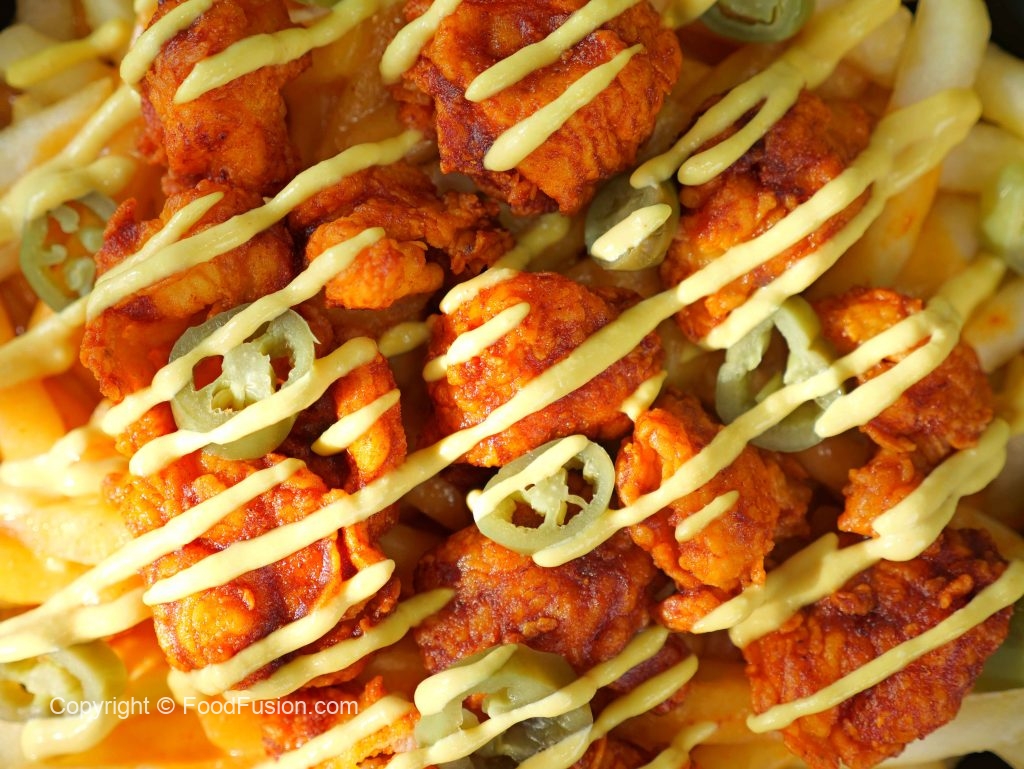 -In a serving dish, add fries, prepared Nashville cheese sauce, crispy chicken, jalapenos, honey mustard sauce & serve!