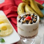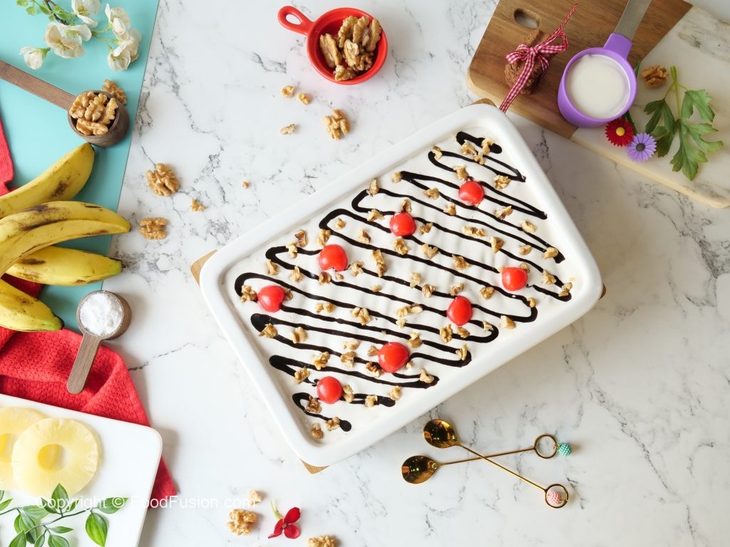 Add banana slices,pineapple chunks,olper’s whipped cream layer & refrigerate until chilled (2-3 hours).