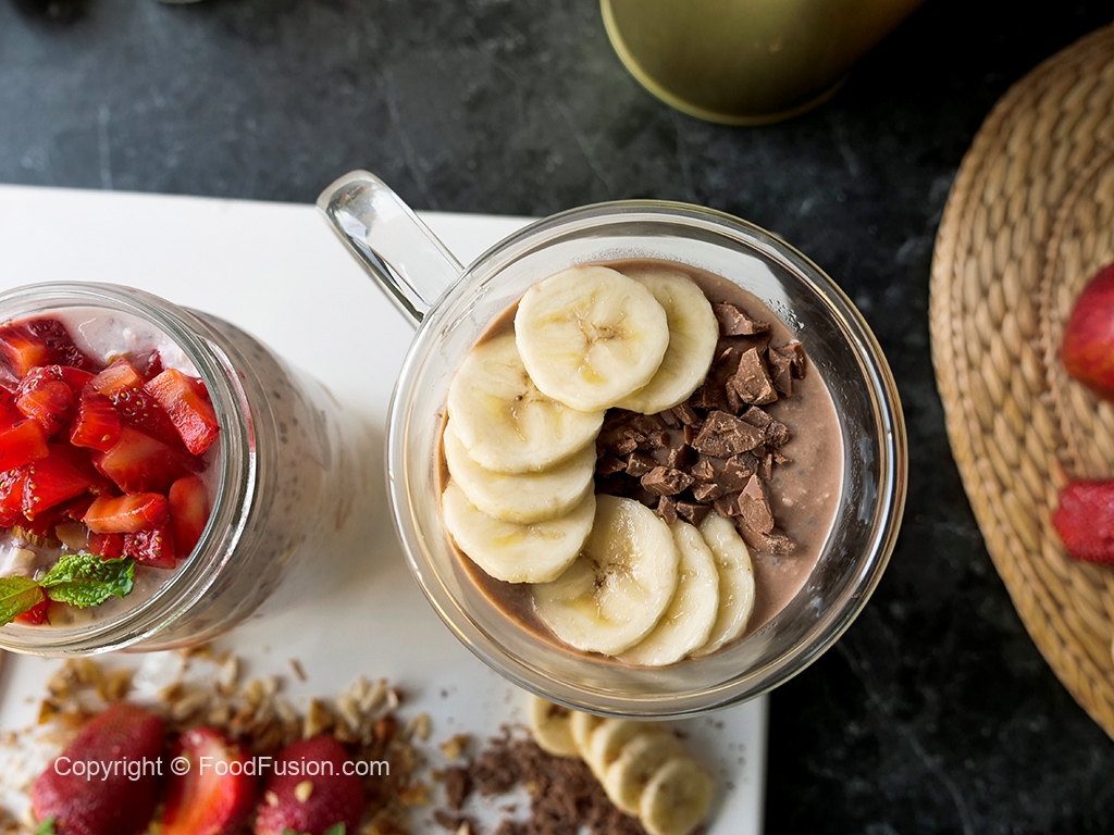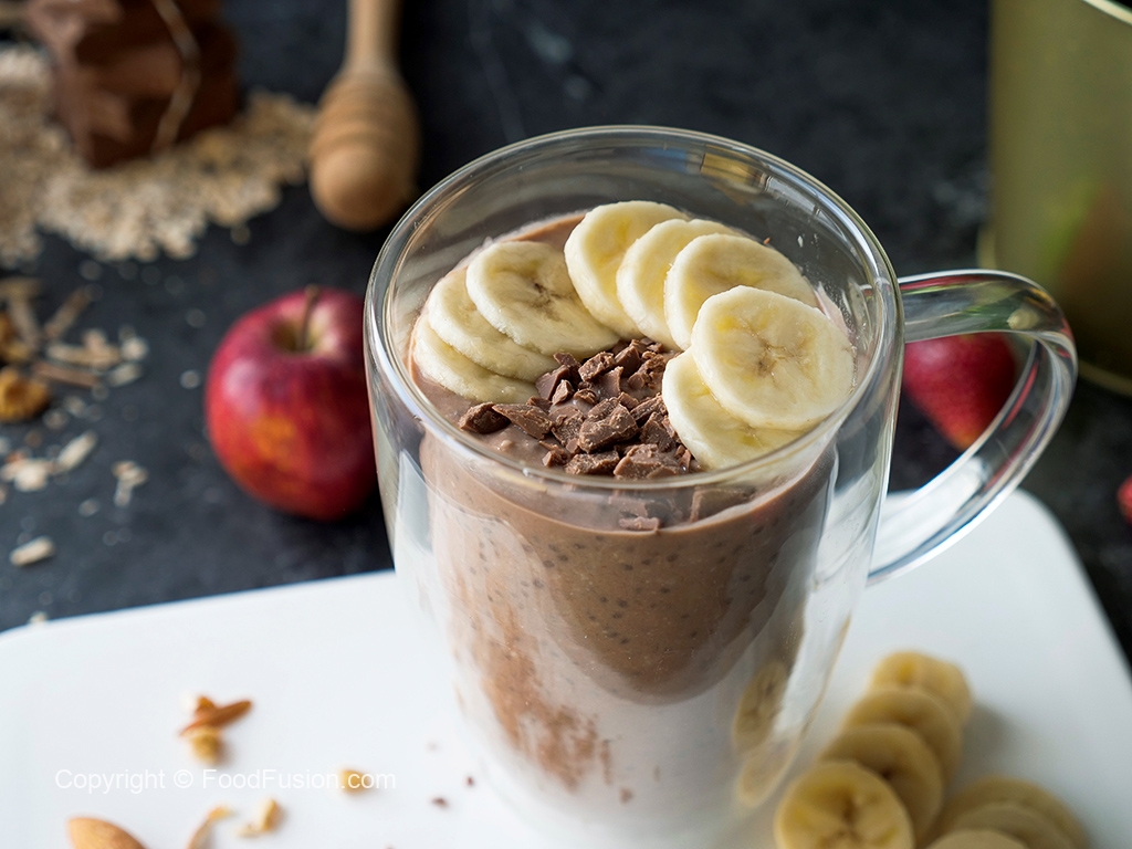 Glass mein instant oats,chai seeds,dahi,banana (fork ki madad sa mash ker lein),chcoclate chunks,cocoa powder aur doodh dal ker ache tarhan mix karein aur dhak ker 6 hours ya overnight kliya refrigerator mein rakh dein.