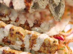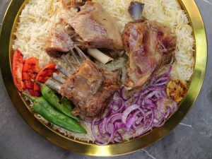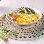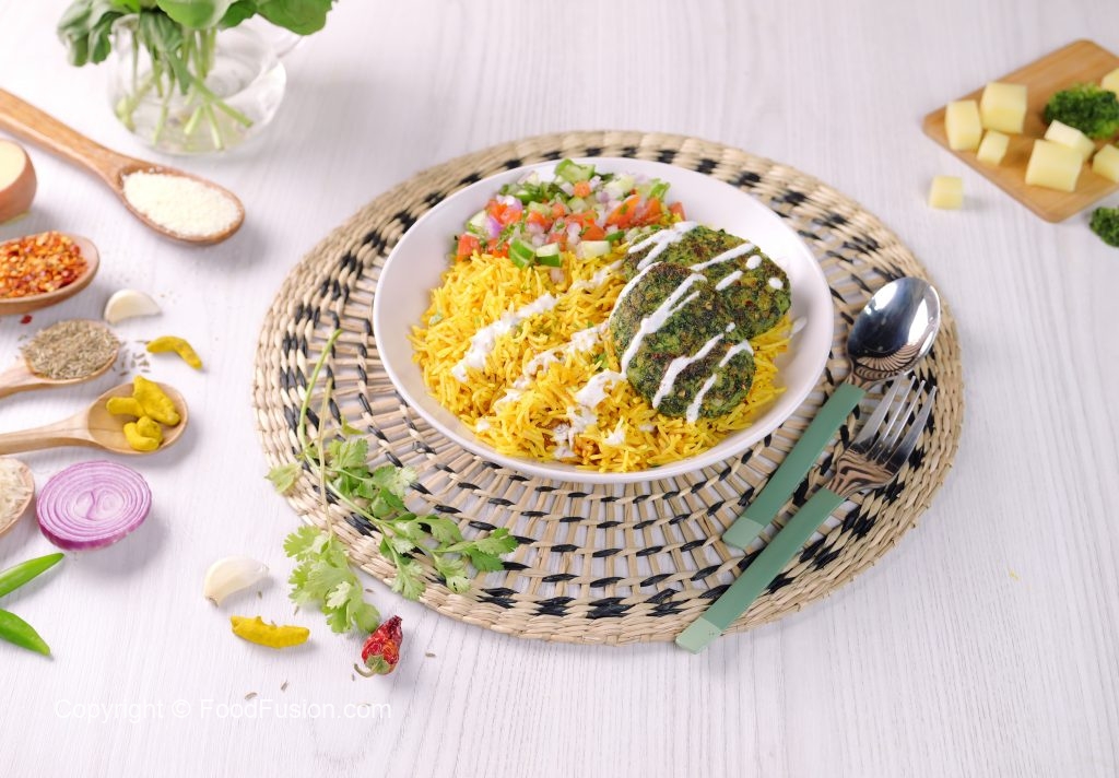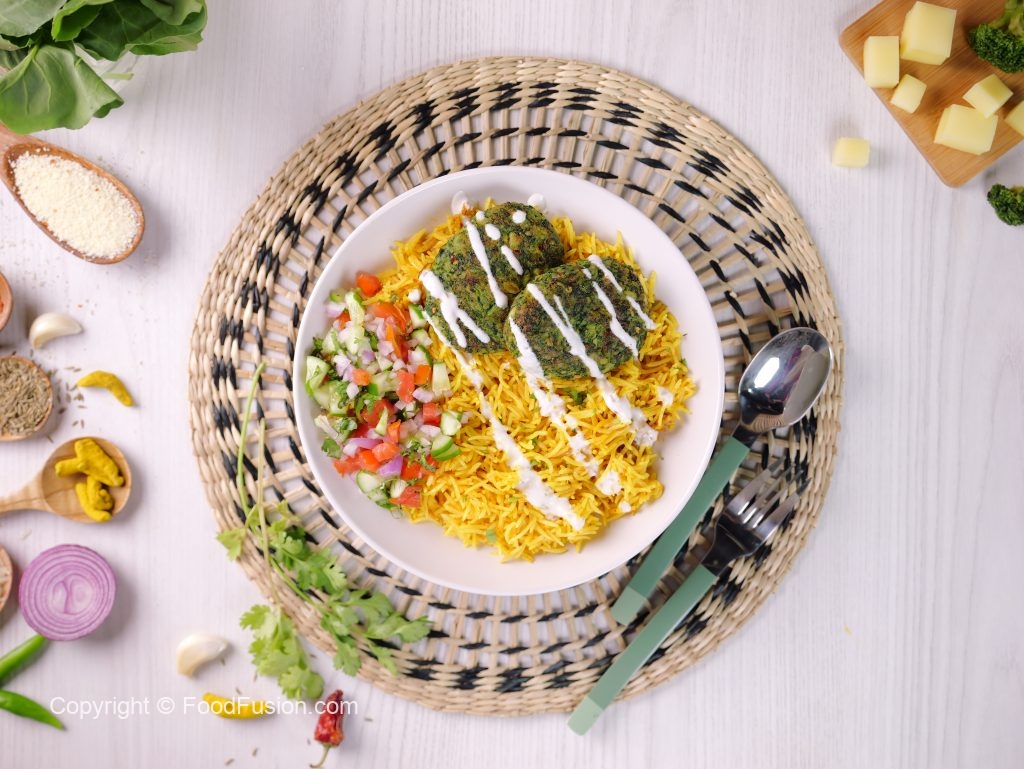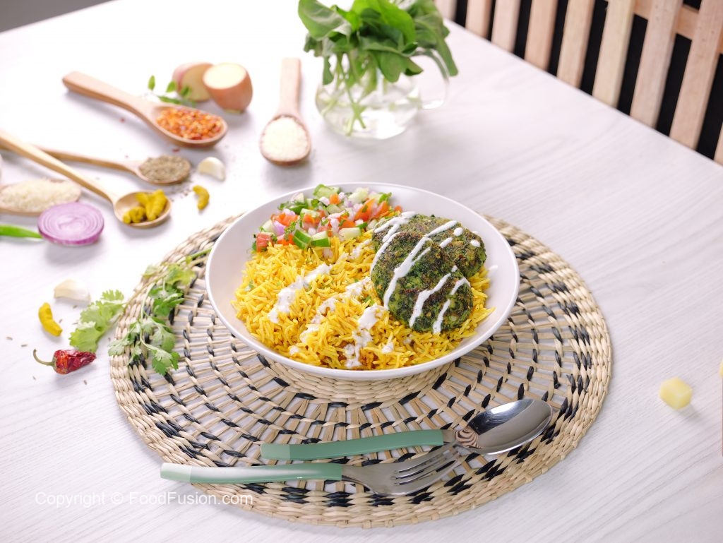 -Serve masala rice with palak cheese kabab,salad & yogurt raita.