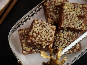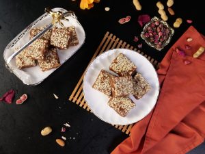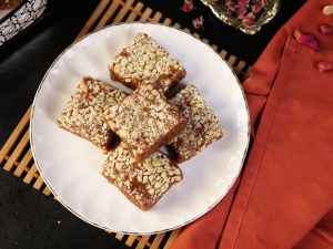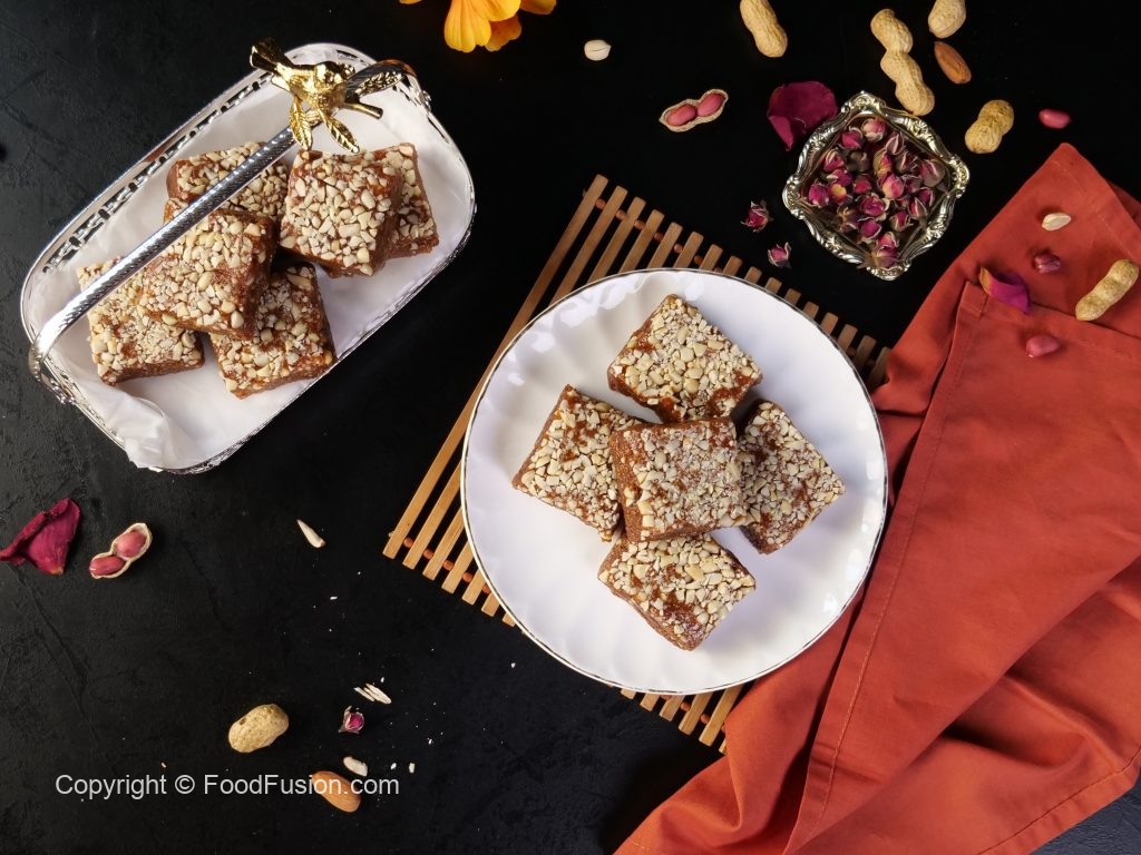 -On a greased mold,add peanuts,prepared barfi & spread evenly.